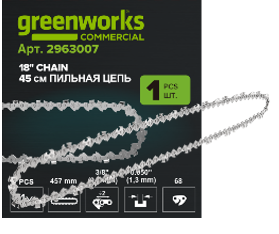 Толщина ведущего звена 1,3 мм (0,05"), Шаг цепи 3/8", количество звеньев 68. Производитель: OregonТМ.